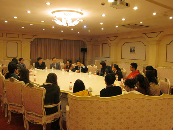下午,马明强秘书长一行在凯旋厅饶有兴致的与我校英语学院国际公务员班和东方语学院泰语、越南语、印尼语专业的学生举行了交流座谈会。座谈会中,今年暑期赴中国-东盟中心实习的英语学院2009级国际公务员班的3名同学首先讲述了自己在实习中的收获感悟、对中国-东盟中心的认识,并表达了对中心领导老师关心照顾的感谢。其他同学则就政府间国际组织的运作模式、工作职责、国际影响和中国与东盟十国之间的关系等纷纷提出问题。马明强秘书长以生动的工作实例和详尽的经济数据为同学们讲解了中国与东盟十国在政治、经贸、文化等领域的密切合作和战略合作伙伴的关系。赖兴部长则从同学们未来的职业发展角度入手,鼓励大家学好自身专业,未来在促进中国和东盟十国人民的友好交往中做出自己的贡献。