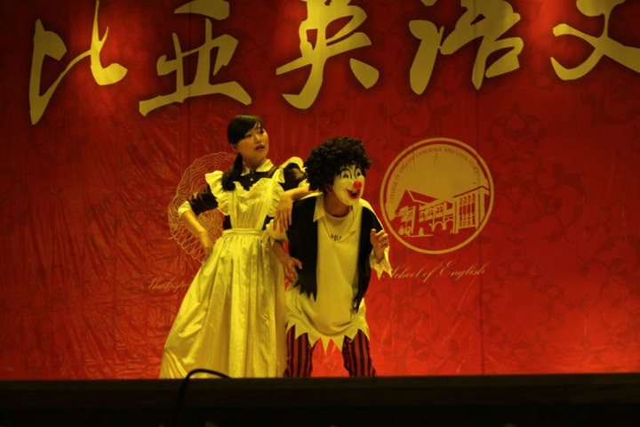 首先登台表演的是喜剧《驯悍记》。人们常说女人如水,但莎翁笔下的凯瑟丽娜却似火,她一身傲气,仿佛嘲笑着世俗男子,嘲笑他们用婚姻、爱情和金钱衡量着人生。拜读经典,由2011级英语语言文学4班、翻译2班和翻译3班组成的《驯悍记》剧组将这一莎翁经典喜剧搬上舞台。经过编剧精心改编,剧组选取男女主人公初见、婚礼和探亲的三幕向大家展现了文艺复兴时期人们的婚姻观与幸福观。全剧最精彩的莫过于硬汉与悍妇的对手戏。为了演好一幕幕驯悍表演,男女主角绞尽脑汁,倾尽全力,表演活灵活现。台上三十分钟,观众阅尽众生百态,殊不知这更是导演、编剧、演员、灯光、道具、场务等几十名同学共同努力的结果。剧终,“猛虎”被驯服,一切辛劳得到回报,似乎皆大欢喜。但智慧如莎翁,欢笑背后留给我们的往往是深刻的思考和感悟。