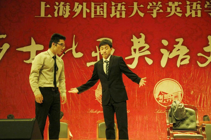 530日晚,英语学院第十七届“莎士比亚英语文化节”系列活动之五——“英韵华章”莎士比亚戏剧公演在松江校区教育会堂大礼堂压轴登场。英语学院2011级全体同学倾情奉献,精彩诠释,将莎翁经典剧目《驯悍记》、《奥赛罗》和《第十二夜》搬上了校园舞台。同时,由顾悦老师指导的旨在全方位提高英语学院人文艺术环境,让人文情怀和艺术氛围弥漫课堂内外的“英华人文艺术中心”也正式揭牌成立。莎士比亚戏剧演出迄今已成功举办了十七届,并成为上外乃至全上海高校的校园文化优质品牌。出席当晚公演的嘉宾有英国领事馆文化教育处艺术项目经理张妤女士和教育项目经理徐洵女士,校就业指导中心主任、飞那儿剧团指导教师李然,校团委办公室主任、大学生艺术中心指导刘昊老师。英语学院院长查明建、党总支书记李尚宏、学院近三十位教师和两名外教参加了活动,二年级精读教研组全体教师担当了评委。担任此次演出的指导教师为李然、刘思远、顾悦和李磊四位老师。