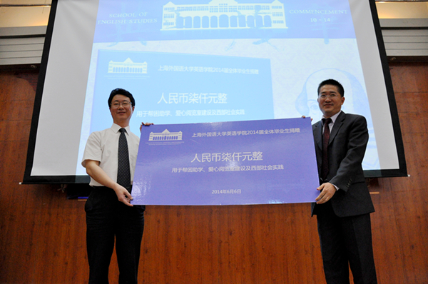 随后,2014届的所有毕业生一一上台,从老师手中接过毕业证书,正式为大学四年的求学生涯划上句点。学院全体毕业生为培养自己四年的学院捐赠了七千元,用于学院帮困助学、西部社会实践和爱心阅览室建设等工作。院长查明建老师与党总支书记孙俭老师代表学院从学生手中接过这笔爱心捐款,孙俭老师代表学院感谢全体毕业生,希望同学们永远把上外英语学院当作自己的“家”,不要忘记同学和老师。之后,2014届毕业生辅导员熊颖哲老师在大家热切的目光中上台演讲,回顾了四年与同学们相处的时光,并希望大家在今后的人生中有所坚持,逐梦不止。