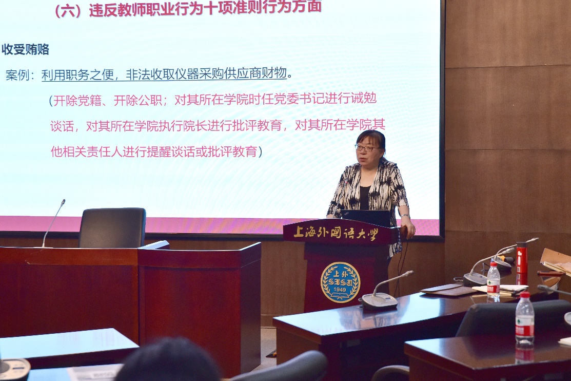 学院党委书记杨雪莲老师向全体教职工传达了5月10日下午刚刚召开的“全国教师思想政治和师德师风建设经验交流暨师德专题教育启动部署视频会议”和“上海外国语大学教师思政与师德师风建设推进会”的重要精神,同时带领大家再次学习《上海外国语大学教职工师德失范行为处理办法》。杨老师强调,正如陈宝生部长所指出的,教师的思想政治素质和师德师风关乎学生成长成才,关乎教育改革发展,关乎社会文明风尚,关乎国家长治久安。教育发展,教师为本,教师素养,师德为先。2021年被确定为“高校教师思想政治工作强化年”,学校从5月至11月将开展系列专题教育活动,全院教职员工要加强学习,对照《新时代高校教师职业行为十项准则》、“四有”好老师、“四个引路人”、“四个相统一”的标准和要求,深化认识,将思想自觉转化为行动自觉,落实到每一项教育教学和管理服务工作中。会上,杨老师还通报了2017级一名研究生因变造身份证件罪受到行政处罚和党纪处分的案例,希望各位老师以此为戒,进一步加强对学生的诚信教育和思想道德建设。