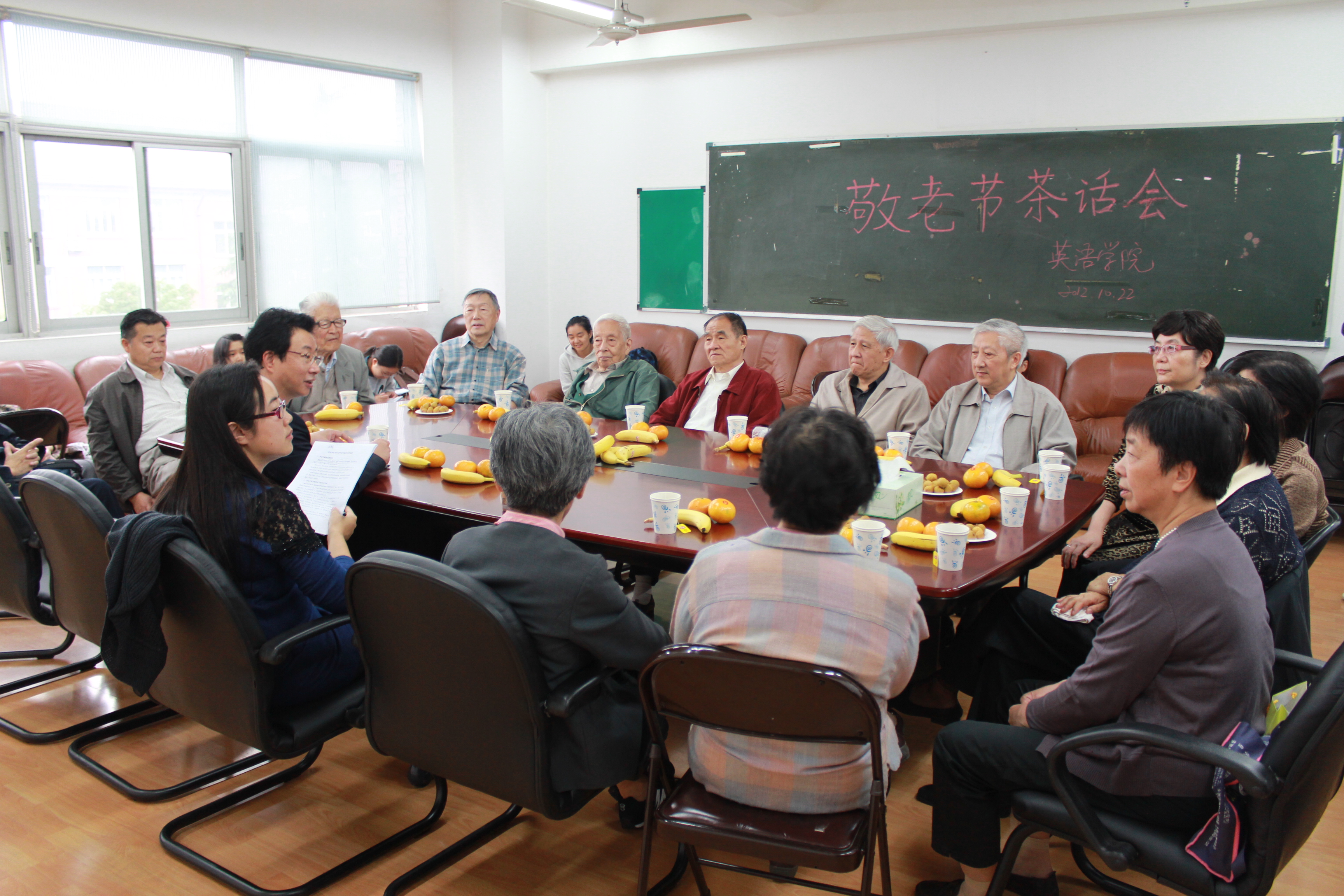 20121022日,英语学院在虹口校区会议室举办了敬老节活动。学院24位离退休教师、学院党政领导及部分教师学生代表参加了活动。