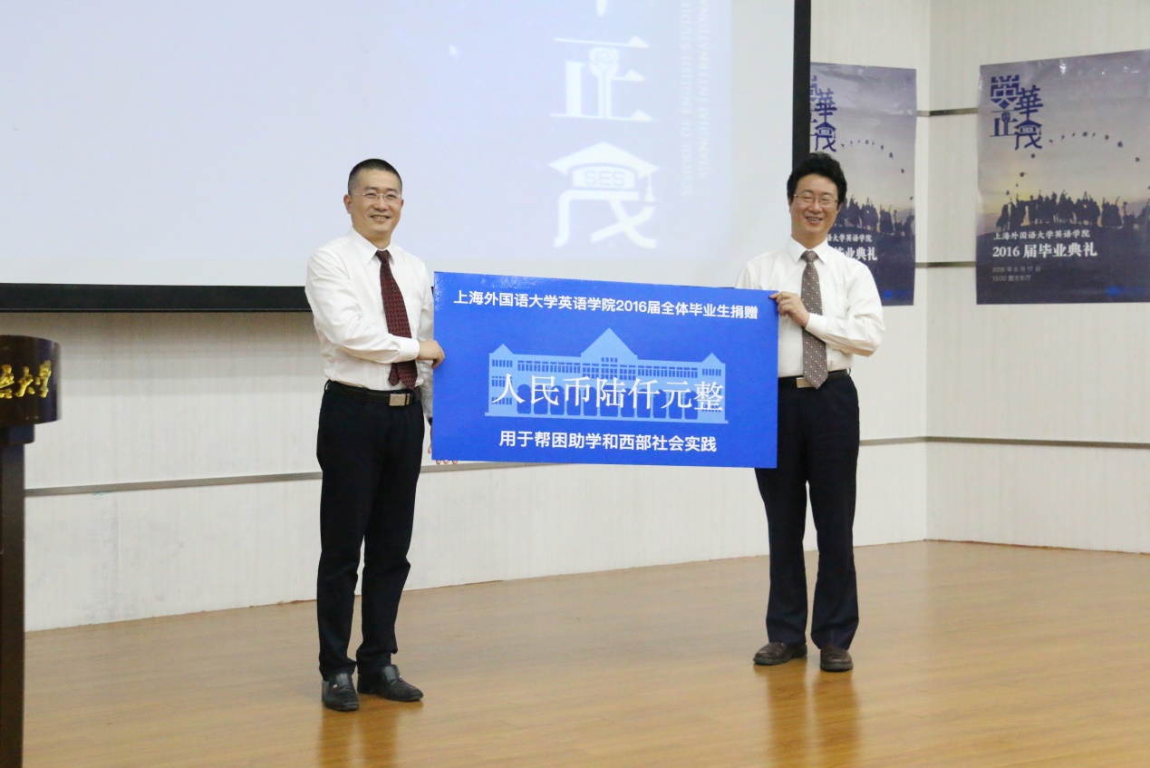感谢师恩环节之后,由徐湾、梁月玲同学代表全体毕业生为学院捐赠六千元,用于帮困助学和西部实践等工作。院长査明建老师和党总支书记孙俭老师代表学院从学生手中接过这笔爱心款项。孙俭老师代表学院感谢全体毕业生,并祝福同学们前程似锦,能够经常回学院看看,英语学院永远是2016届同学们的家。之后,2016届毕业生辅导员郝振老师在同学们的掌声中上台致辞,为同学们四年的成长感到欣慰与鼓舞,并送上了毕业之际的叮嘱与祝福。毕业典礼的最终环节是由学院行政领导和院学位评定分委会教授代表査明建、王恩铭、乔国强、刘全福、吴其尧、许立冰、王欣和孙会军等八位老师为每一位毕业生拨穗并授予学位证书。在同学们与老师依依不舍的合影与交谈声中,英语学院“英华正茂”2016届毕业典礼顺利闭幕。