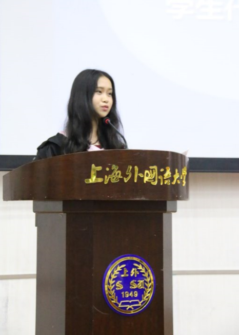 在回顾大学生活环节中,2016届毕业生自编自导自演的微电影《珍贵的唯一》再次带领同学们穿梭回四年前刚刚进入大学时的场景,回忆起对未来大学四年的憧憬,即使想象与现实并不完全一致,但同学们依旧在四年中锻炼了自我、收获了珍贵的友谊,得到了独一无二的大学回忆。微电影中记录了2016届毕业生日常学习生活中熟悉的场景与片段,以师生情、亲情、友情、爱情为主线细数过去四年的成长与体悟,感谢老师的谆谆教导、同学互相的鼓励与陪伴。看着这些熟悉的场景和记忆,同学们时而会心微笑,时而泪光闪闪,英华四年不仅是同学精彩绽放的青春年华,更是作为英华人的骄傲与自豪。随后,徐景同学代表2016届全体毕业生发言。徐景在致辞中细数同学们在英华四年的共同回忆,引得同学的阵阵掌声;她特别感谢英语学院所有辛勤工作,韬光韫玉的老师们,没有老师们的言传身教,也不会有同学们深厚的专业功底和开阔的人文视野,能够在英华度过这样精彩的四年,非常的幸运。她还提到将不断地以“格高志远,学贯中外”的校训要求自己,做一名优秀的上外人。发言的最后,她代表全体毕业生表达了对学校、学院、老师、家长和同窗们的感谢,并祝福每一位英华人在未来都能够熠熠生辉,闪闪发光。