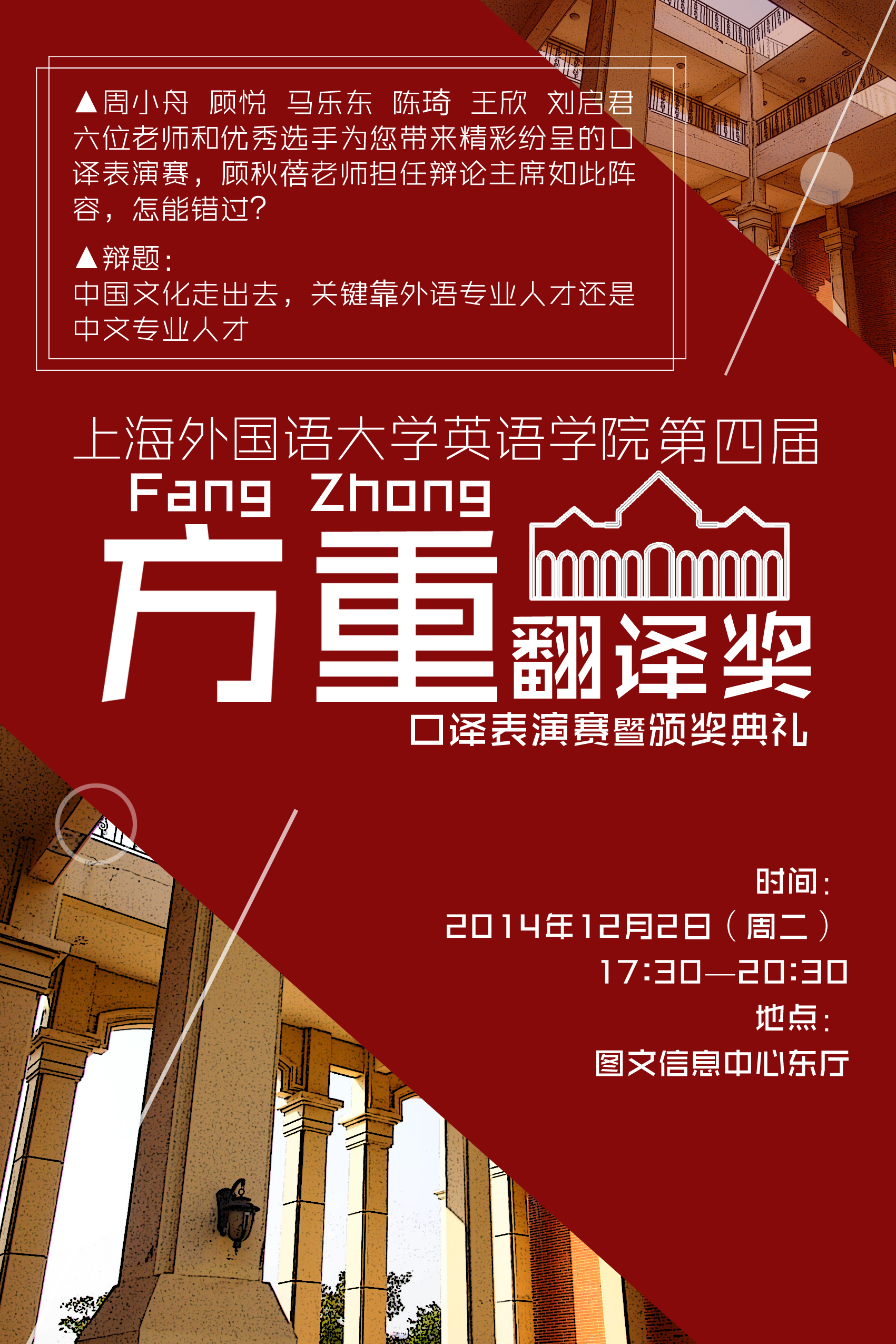 当晚的口译比赛采取辩论的形式,6名老师围绕“中国文化走出去,关键靠外语专业人才还是中文专业人才”这一辩题展开辩论。上半场用中文、下半场双方互换立场后用英文进行辩论;由遴选出的6名口译选手进行交替传译。此外,当晚还会为方重翻译奖笔译大赛获奖选手颁奖。