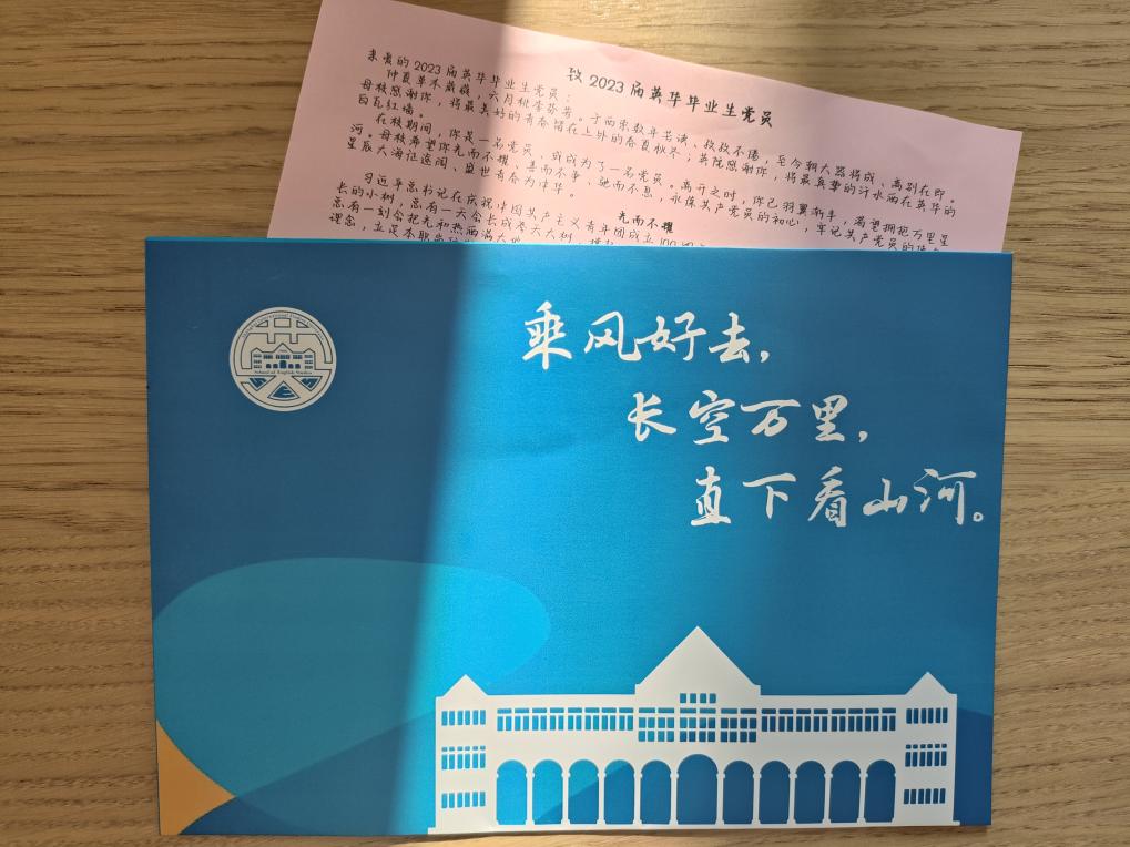 大会最后,专职组织员张文洁、毕业班辅导员李秀秀、廖莹文共同为毕业生党员朗诵了学院为大家准备的一封信,“光而不耀、善而不争、驰而不息”,听着学院师长对自己的真诚寄语,党员们纷纷拍照留念。上外蓝的信封,更是满载着英华对大家的期许和希望,陪伴同学们背上行囊,开启新的人生征程。