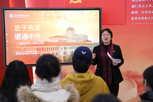 12月15日,副校长张静和英语学院研究生第十四党支部的党员同学们共同探讨了这一话题。本次“忠于热爱 语通中外”主题党日活动由支部书记颜若偃主持,专职组织员张文洁、教工第二党支部书记宋亮观摩学习。