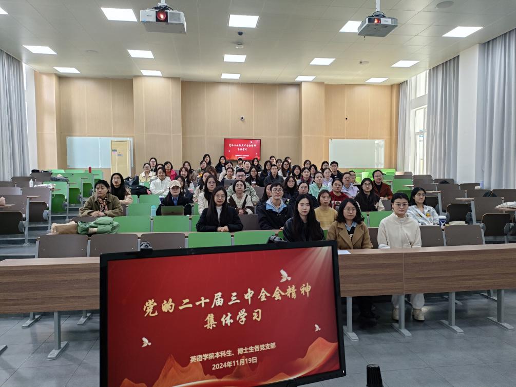 为深入学习贯彻落实党的二十届三中全会精神,深刻领会和把握习近平总书记关于全面深化改革的一系列新思想、新观点、新论断,提高广大青年学生的政治站位,增强广大青年学生党员深学细悟的政治自觉、思想自觉和行动自觉,11月19日、12月3日,英语学院分批组织各本科生支部、博士生支部和硕士生支部集体学习党的二十届三中全会精神。